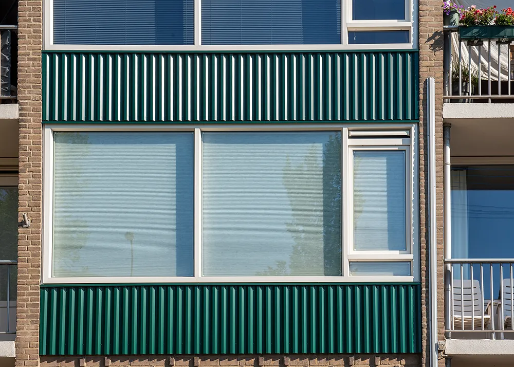 Daarnaast heeft Kumij de borstweringsbeplating geleverd en gemonteerd aan zowel de voor- als achterzijde tussen de verdiepingskozijnen. Deze elementen dragen bij aan de moderne en uniforme uitstraling van het gerenoveerde complex.