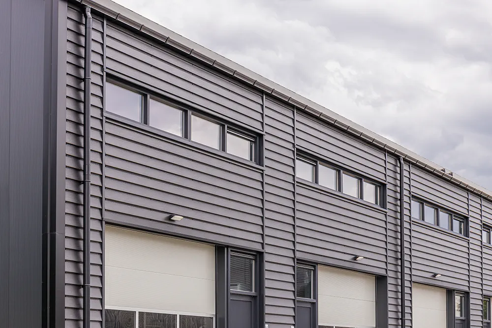 Voor het nieuwbouwproject in Nunspeet, de realisatie van een bedrijfsverzamelgebouw, leverde Kumij K-VISION Trend 45 graden kozijnen voorzien van renolitfolie met nerfstructuur in kleur RAL7021. Het gebouw valt op door het ontwerp met houten lamellen aan de kopse kant. Het resultaat is een multifunctionele ruimte die klaar is om diverse ondernemingen te huisvesten en te inspireren.